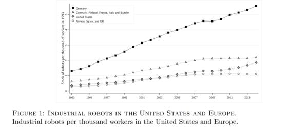 同一时期,在工作场所使用机器人的增加也使工资降低了约0.4%。“我们发现负面的工资效应,因为受影响的地区工人的实际工资正在流失,因为机器人非常擅长与他们竞争。”