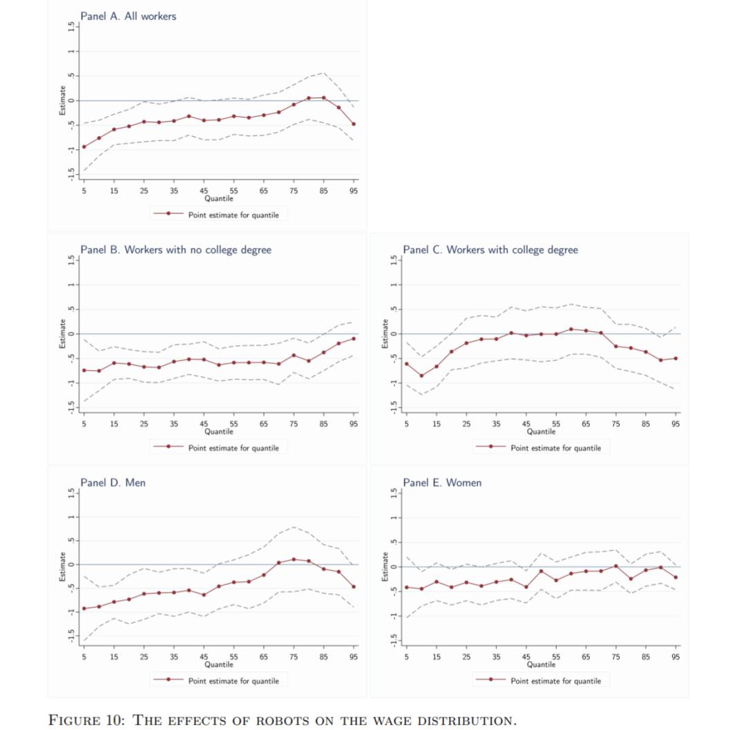 机器人渗透率对不同教育程度、性别的就业变化的影响。再者,机器人渗透率对不同收入工人的影响。使用分位数回归研究显示,那些没有大学学历的员工受到的负面影响显著;对于拥有大学学历或以上学历的人来说,这是一个很好的机会。这些结果证实了,机器人的负工资效应主要分布在底层和中层劳动力。