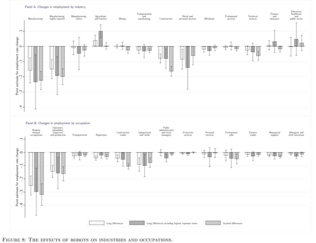 比如,在保持产量和价格不变的情况下,机器人直接替代了工人,但是由此产生的成本降低也增加了产品和劳动力需求。而且,工人可能会被不同的行业吸收,并且专门从事新的和补充的任务。对这种整体均衡状态的探究,也是这篇研究的重点,当然,最终结果也如前文所示,并不乐观。