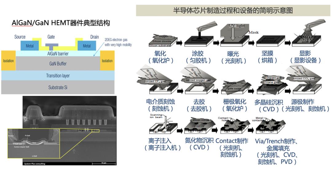 GaN和SiC芯片的制造是产业链的核心环节。其制造过程与硅基芯片类似,都需要复杂的半导体芯片制造工艺和流程,基本上每一类工艺都对应一种专用的半导体芯片设备,在微米和纳米尺度进行制造。