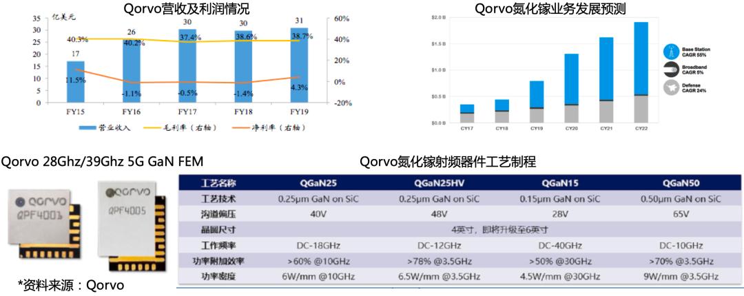 Qorvo是GaN芯片领导厂商,尤其在国防和基础设施领域,Qorvo在2017年就最早推出39Ghz双通道GaNFEM,2018年推出业内最强GaN-on-SiC晶体管Transistor,公司有望在GaN领域实现业务快速增长