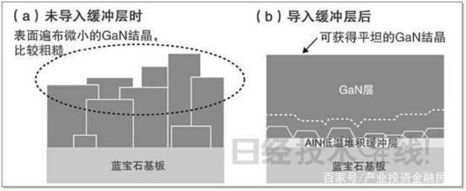 *导入缓冲层提高晶体品质。在蓝宝石基板上直接生长GaN时,会零散地生长一些微小晶体,因此GaN晶体的表面比较粗糙(a)。通过在蓝宝石基板与GaN晶体之间设置“低温堆积缓冲层”,便可获得平坦的GaN晶体(b)