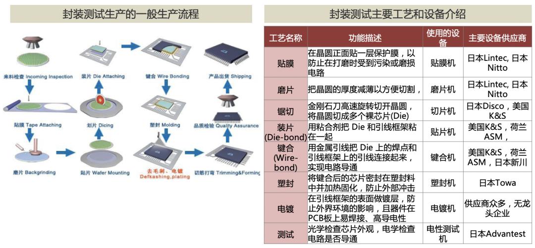 封装是把制作集成电路之后的晶圆转变为一个个芯片成品的过程。封装厂独立于晶圆制造厂,使用标准化的工艺流程和多种专门设备。