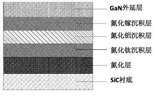 MOCVD生长依次将氮化钛层、氮化铝层和氮化镓层沉积在SiC衬底上,气氛是以三甲基镓(TMGa)、三甲基铝(TMAl)、三甲基钛(TDEAT)和氨气(NH3)分别作为Ga、Al、Ti和N源,以氢气(H2)为载气。
