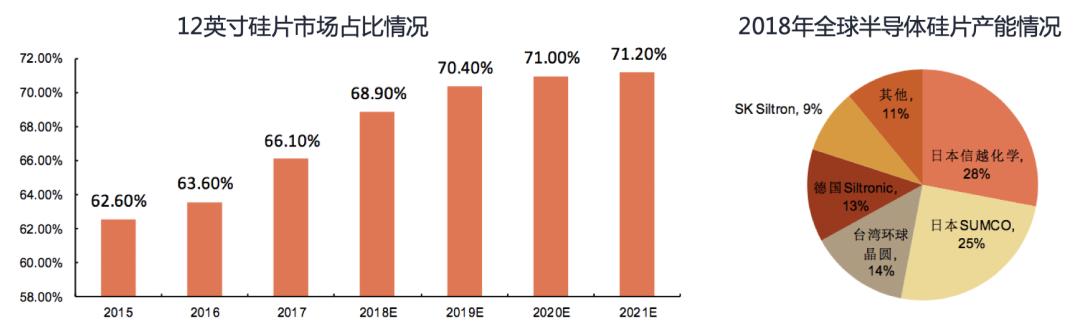 大尺寸硅片是硅片未来发展的趋势,目前8英寸硅片主要用于生产功率半导体和微控制器,逻辑芯片和存储芯片则需要12英寸硅片。2018年12英寸硅片全球市场份额预计为68.9%,到2021年占比预计提升至71.2%。12英寸硅片主要被NAND和DRAM需求驱动,8英寸主要被汽车电子和工业应用对功率半导体需求驱动。长期看12英寸和8英寸依然是市场的主流。