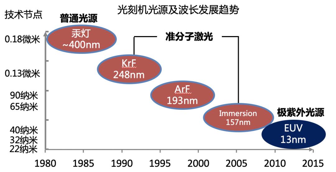 光刻设备的核心部件主要包括光源、光学透镜组、对准系统。光源的波长越短,可达到的最小线宽分辨率越低 ,设备单价也越高。