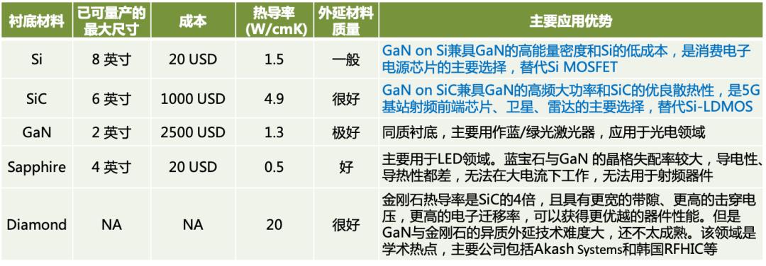 采用外延技术,可以将GaN生长在SiC、Si、蓝宝石、金刚石等其他材料衬底上,有效的解决GaN衬底材料的限制问题。GaN on SiC和 GaN on Si是未来的主流技术方向。