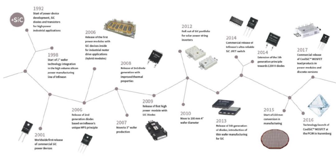 Infineon于1992年开始SiC领域研发,2001推出全球首个商业化SiC二极管,2006年推出全球首个采用SiC组件的商用电源模块,目前已经已经发展至第五代。
