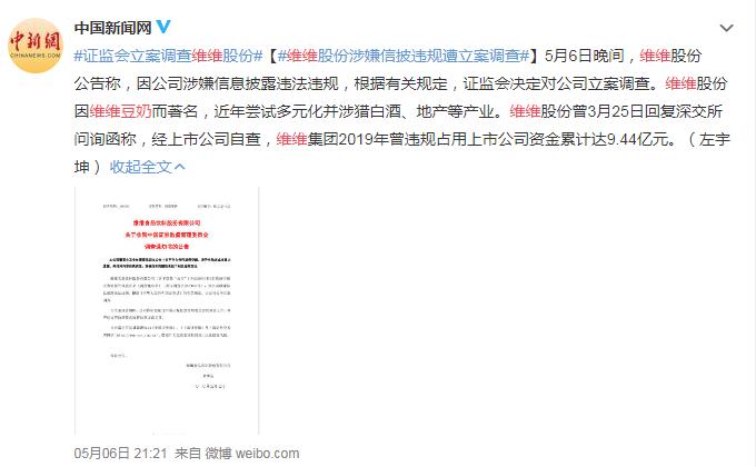 2、扬子晚报:维维豆奶自曝股东曾违规占用9亿 证监会立案调查