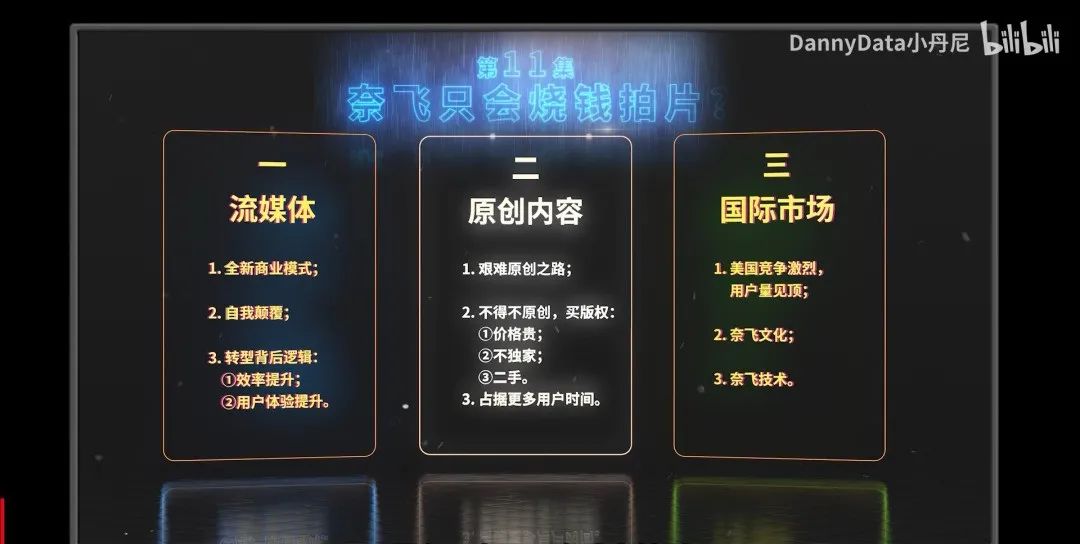 先说结论:奈飞的牛比之处当然不止是烧钱拍片,而在于奈飞三次重大转型——流媒体、原创内容和国际市场。估计这里有同学要反驳我了:唉Danny,你说的原创内容不就是烧钱拍片吗?