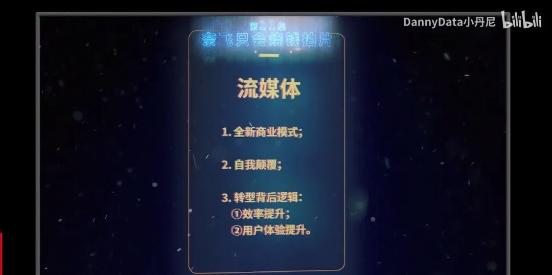 这里我给不太熟悉奈飞的同学做个丹尼百科。刚才我说了奈飞使用了全新的商业模式,这里所说的并不是指你们现在看到的奈飞流媒体会员制商业模式,流媒体说白了就是线上看片,比如你们在B站看《人生一串》、追番剧都是流媒体模式。