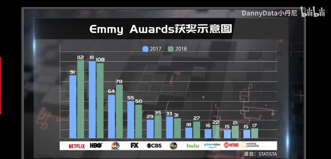 奈飞优秀的原创内容不用我再去吹彩虹屁了,我在视频开头所说的《黑镜》、《纸牌屋》等等已经是家喻户晓了,再比如奈飞虽然起步比HBO拍电视剧晚很多,但在2018年获得了112项艾美奖 (电视剧界的奥斯卡) 提名,把过去17年称霸艾美奖的电视剧巨头HBO干下去了,用牛比两个字形容就完事儿了。
