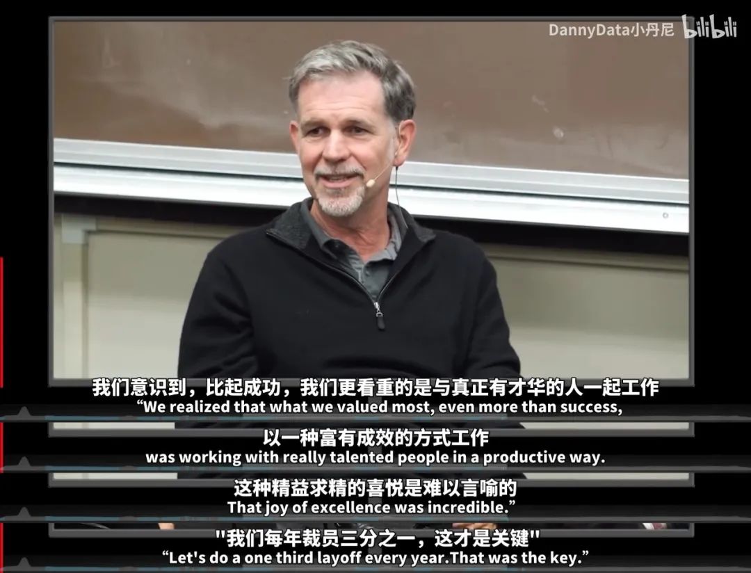 说白了就是只招聘那些对自己成功负责的聪明人才,保持团队的高水平人才密度,这和奈飞之前在经历互联网泡沫时的经历相关。当时奈飞解聘了三分之一非核心人才,只留下高水平人才,反而让团队整体效率提升了。所以,奈飞每年淘汰三分之一员工,这已经是奈飞的常规项目了。
