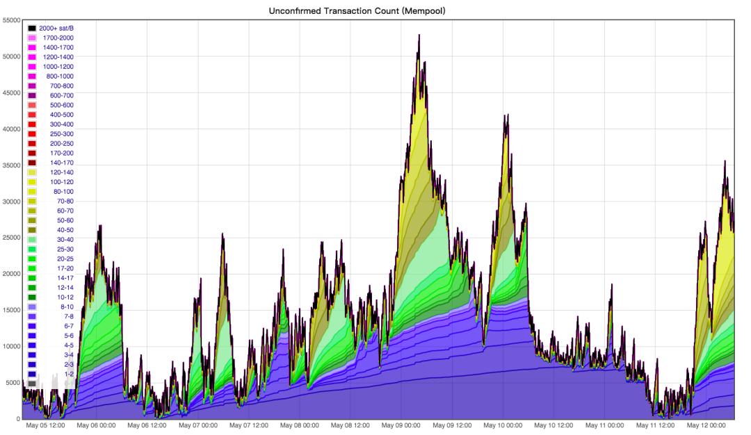 据 BTC.com 数据,比特币网络 24 小时的交易速率为 3.5 笔/秒,几乎为平均水平 7 笔/秒的一半;但查看比特币待确认交易笔数(如下图),并未见得高到离谱,网络并不比 5 月 9 日、10 日行情到来时拥堵。