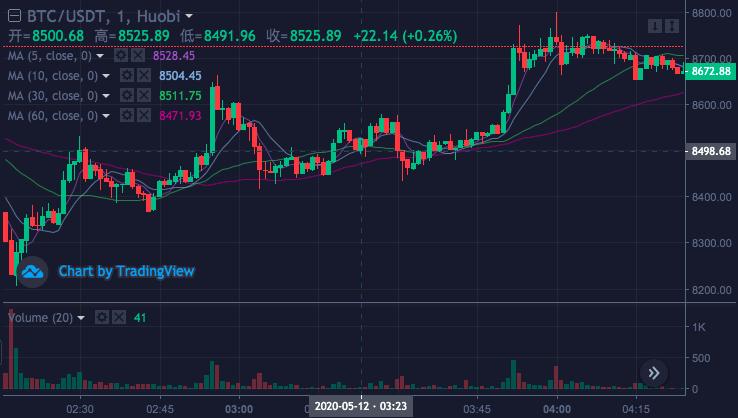 从 24 小时币价走势看,根据火币数据,比特币在减半前先拉升(7%)后下降(-9%),减半开始前开始触底反弹,最高上涨 5%,此后于 8500 美元附近震荡,日内涨幅为 0.6%,7 日涨幅为 -2.3%。