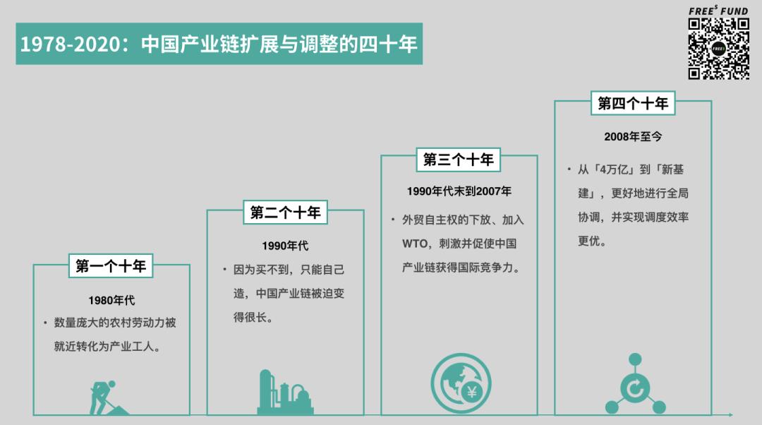 1978-2020,从农村劳动力转化到发展外贸、加入 WTO,再到「四万亿」和新基建,中国产业结构的扩张与调整是一个不断提高附加值的过程。