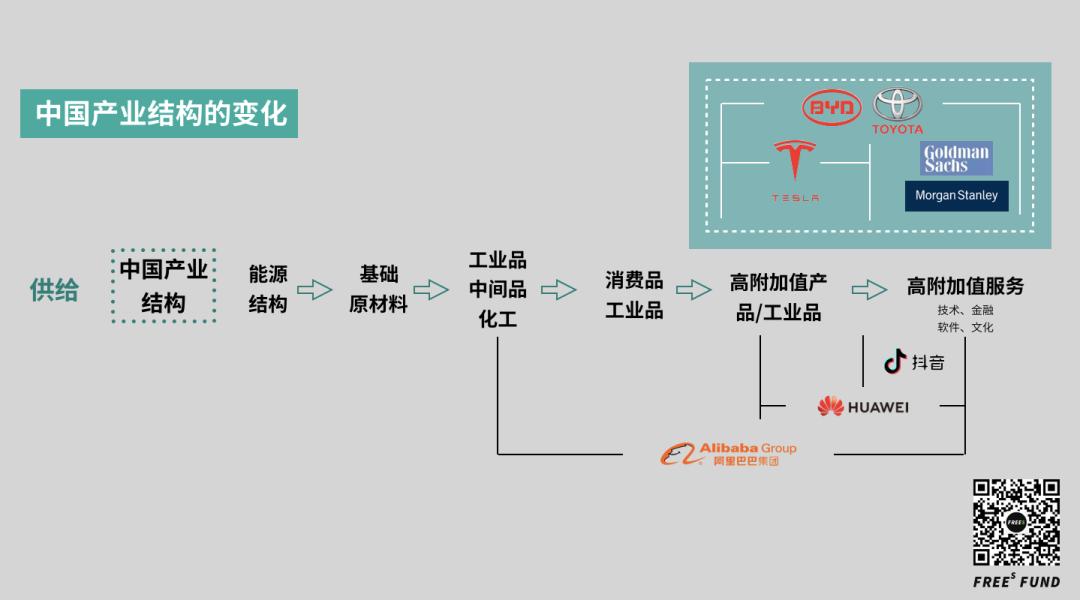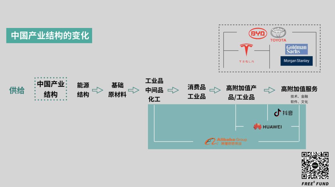 这条链长什么样?你可以看下图「中国产业结构」那一行。我们把它画成了一条横轴:从能源结构—基础原材料,延展到工业品/中间品/化工,再发展为消费品/工业品,然后一路爬升到高附加值产品/工业品以及高附加值服务。