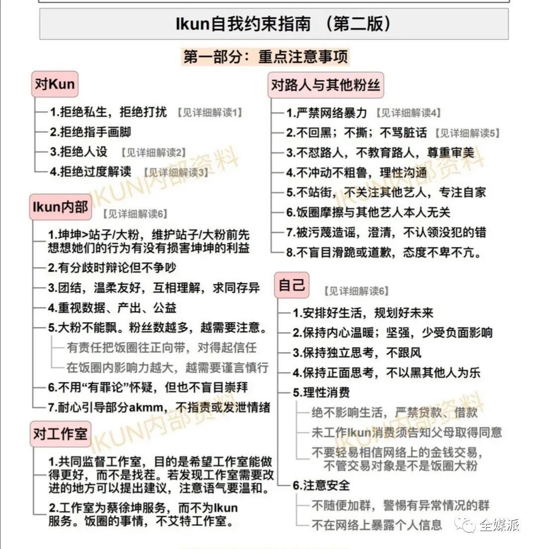 网络上曾流出一个由蔡徐坤粉丝群体整理的《ikun自我约束指南》,这份指南从五个维度入手,归纳总结了粉丝的各类注意事项。并且特意标明:粉丝是自由的,指南只是一个建议,希望饭圈可以保持积极向上的态度,互相理解,求同存异。