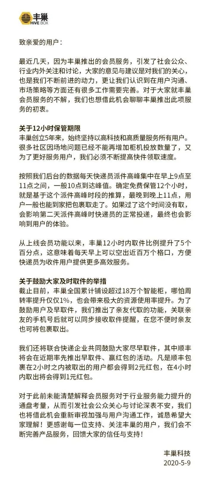 5月9日晚,丰巢智能柜发布了致用户的一封信,表示自从会员功能上线后,短短12个小时内取货率就提升了5%。丰巢将联合快递企业推出优惠活动,共同鼓励大家尽早取件,丰巢还表示将重新审视加强与用户沟通工作。