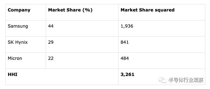 基于Herfindahl-Hirschman指数(“HHI”)(一种市场集中度的常用度量),我们计算了DRAM行业集中度。HHI大于2500,表明市场高度集中,下表清楚地表明D3确实是寡头。