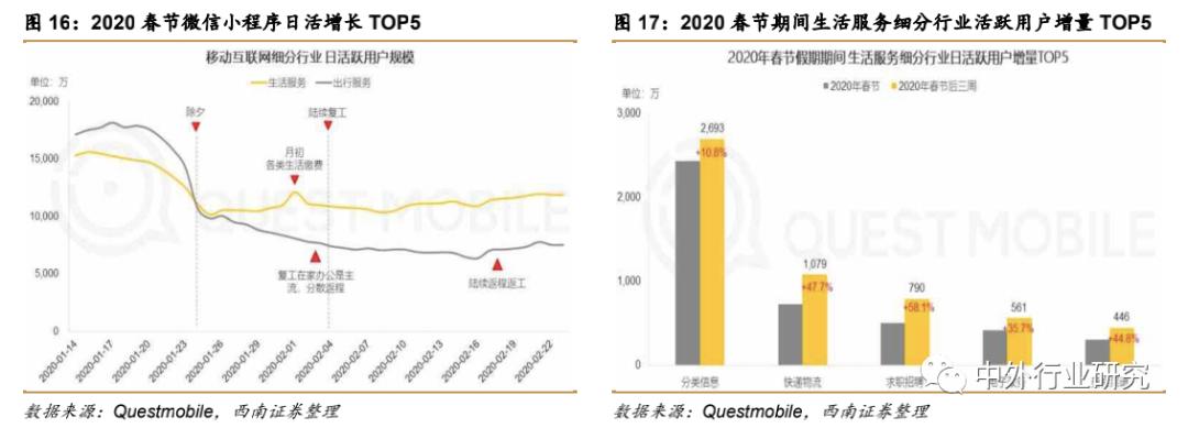 相较线上出行服务,线上生活服务受疫情影响较小,且分类信息、快递物流、求职招聘、电子政务和美食菜谱等细分行业在春节之后实现了快速恢复。