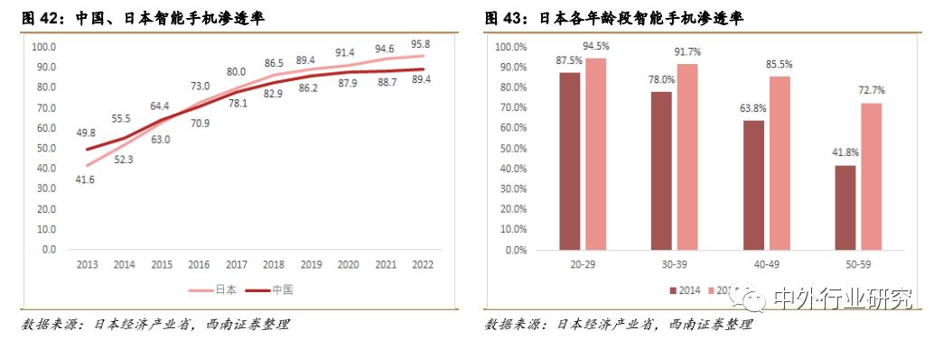 日本智能渗透率“后来居上”,并继续向中高年龄层渗透,成为全球智能手机最高的国家。