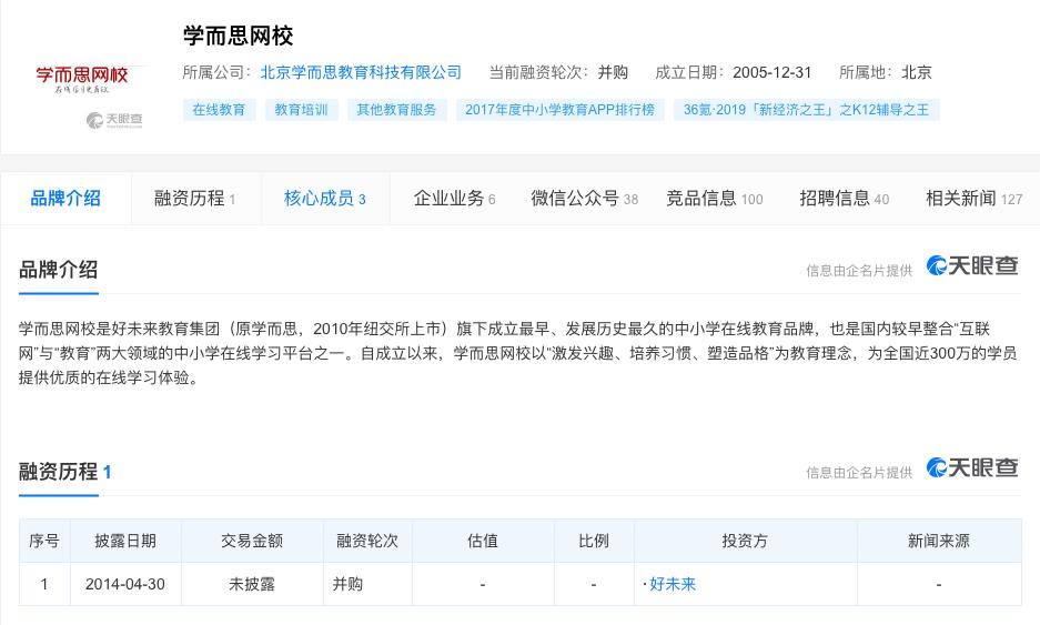 天眼查数据显示,学而思网校是好未来教育集团(原学而思,2010年纽交所上市)旗下成立最早、发展历史最久的中小学在线教育品牌,也是国内较早整合“互联网”与“教育”两大领域的中小学在线学习平台之一。