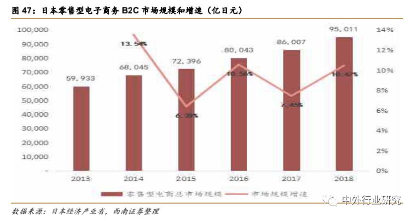 2018 年服务型电商规模达 6 万亿 6471 亿日元,较 2017 年同比增长 11.59%。13-18 年间 CAGR 达13.91%。