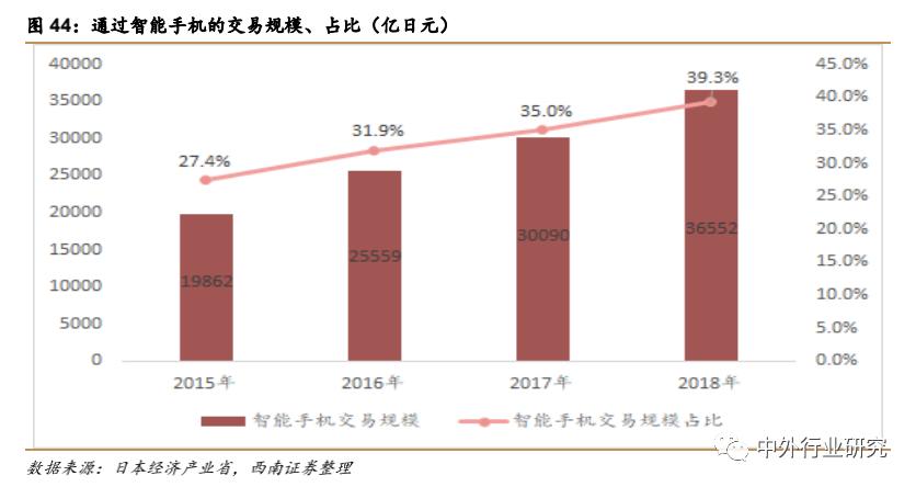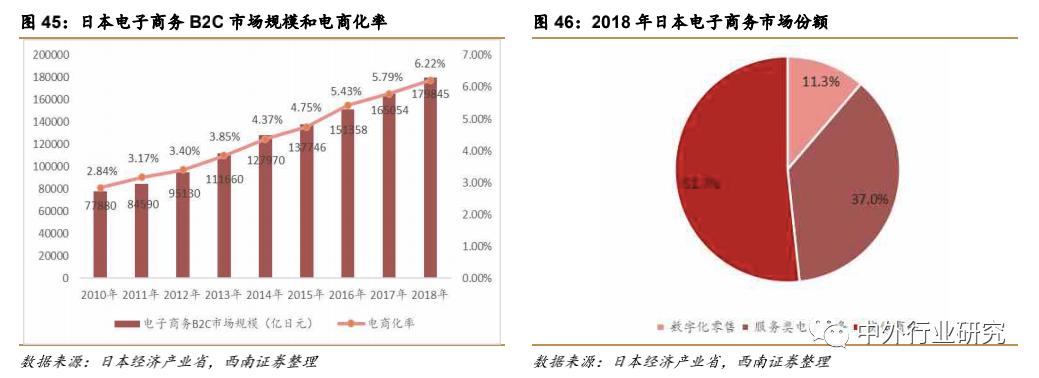 电子商务规模稳定增长,服务类占比稳步提升。实体商品占比51.7%,市场规模达 9 万亿 2992 亿元,服务类电子商务占比达 37%,市场规模为 6 万亿 6471 亿日元。