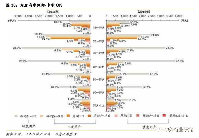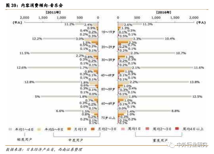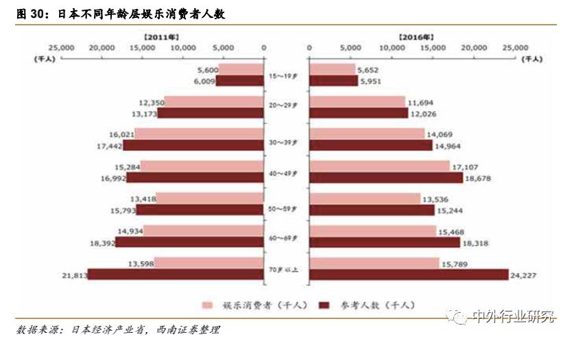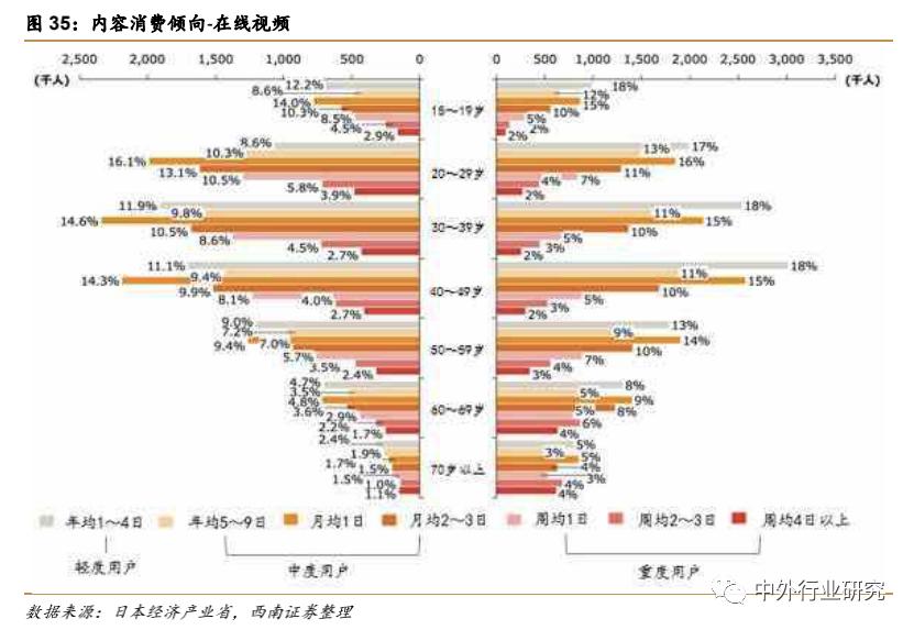 从日本的内容消费人口情况分析,在15-49 的各个年龄段,娱乐内容渗透率均达 90%及以上,在 50-69 年龄段达到81%及以上,70 岁+人群渗透率约 65%左右。