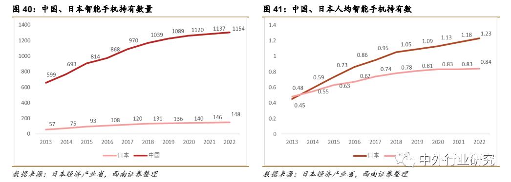 根据经济产业省的报告预测,日本2022 年智能手机全国持有量将达到 1.48 亿台,人均持有智能手机设备数超过 1.23 台,预计将成为全球人均智能设备持有量最高的国家之一。
