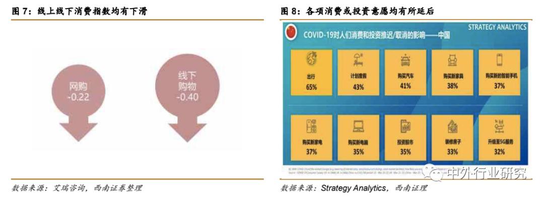 根据艾瑞资讯数据,疫情期间消费者线上线下消费意愿均有不同程度减弱,此外Strategy Analytics 消费者洞察团队研究报告数据指出,消费者的各项消费或投资均有所推迟。