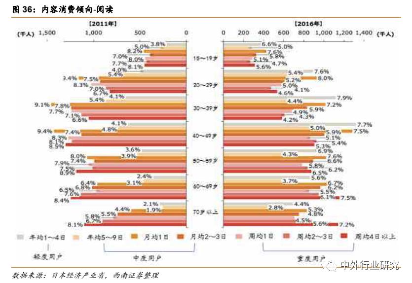 阅读用户的占比和频度均随年龄层提升。