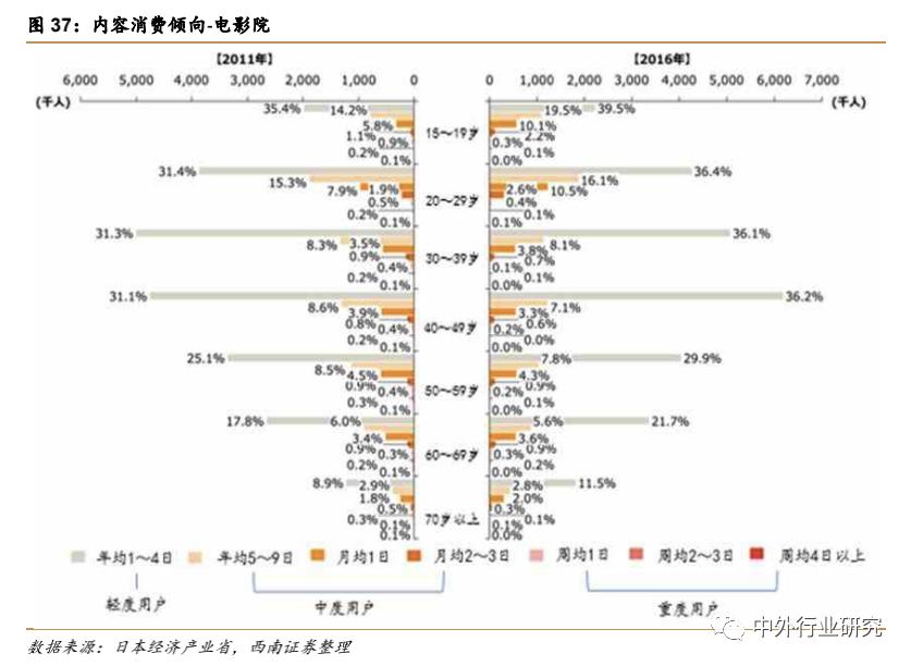 对比2011 年和 2016 年的数据,电影院年消费 1~4 日占比在各年龄层均有所提升,而高频次占比均有所下滑,可见电影院消费偏好在消费者全年龄层次均有所下降。