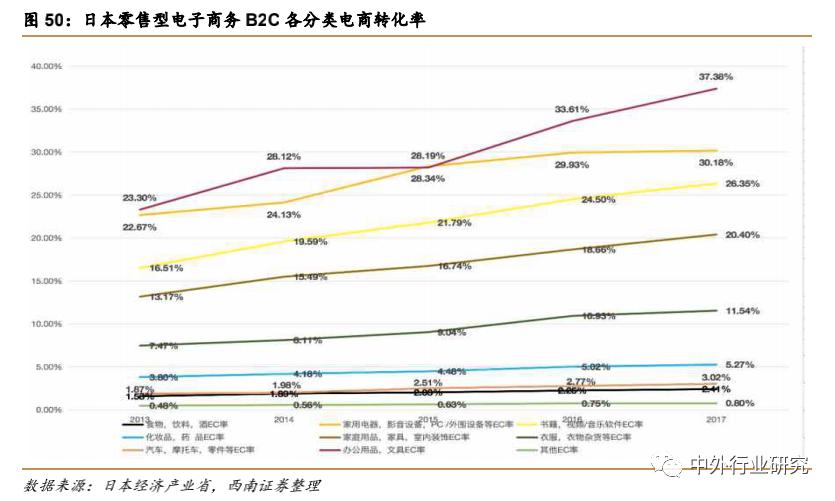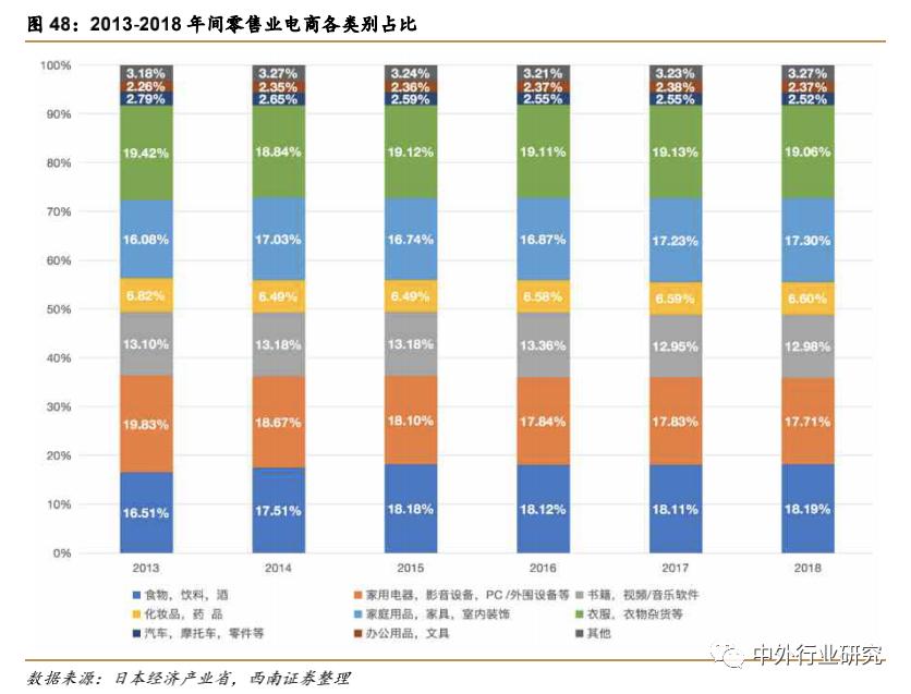 1)“食品,饮料,酒”是商业交易市场最大的类别,其电商市场规模为 16919 亿日元,比上年增长 8.60%,电商转化率为 2.64%,相对较低,但这是其对应的商业市场规模较大,估计为60 万亿日元以上。