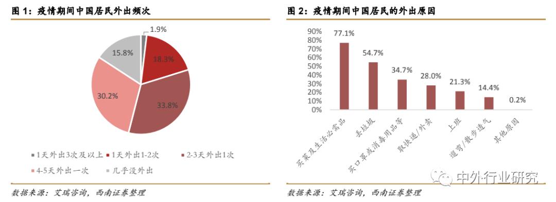 疫情期间,消费者积极响应国家防控倡议,通过减少出门有效减少新冠传播,根据艾瑞咨询调研数据,在疫情期间33.8%的居民 2-3 天出门一次,30.2%的居民4-5 天出门一次,15.8%的居民家庭几乎无人外出。