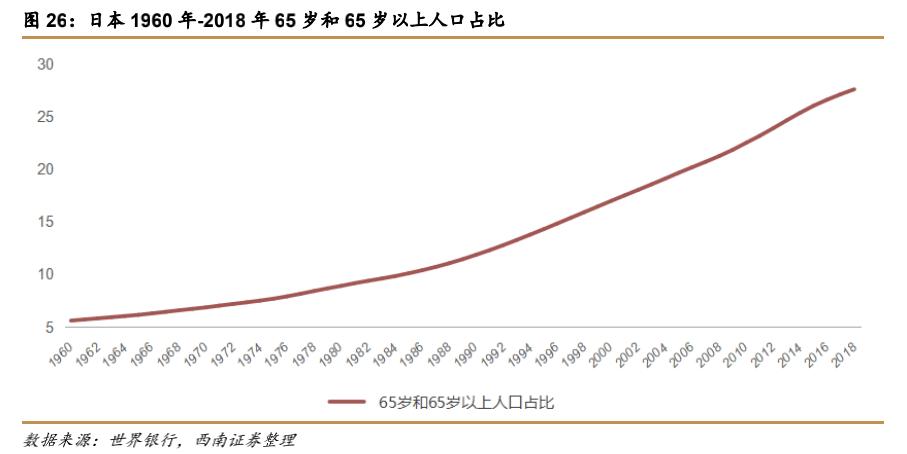 根据世界银行数据,日本从 1970年开始步入老龄化社会,65 岁及以上人口占比持续提升。