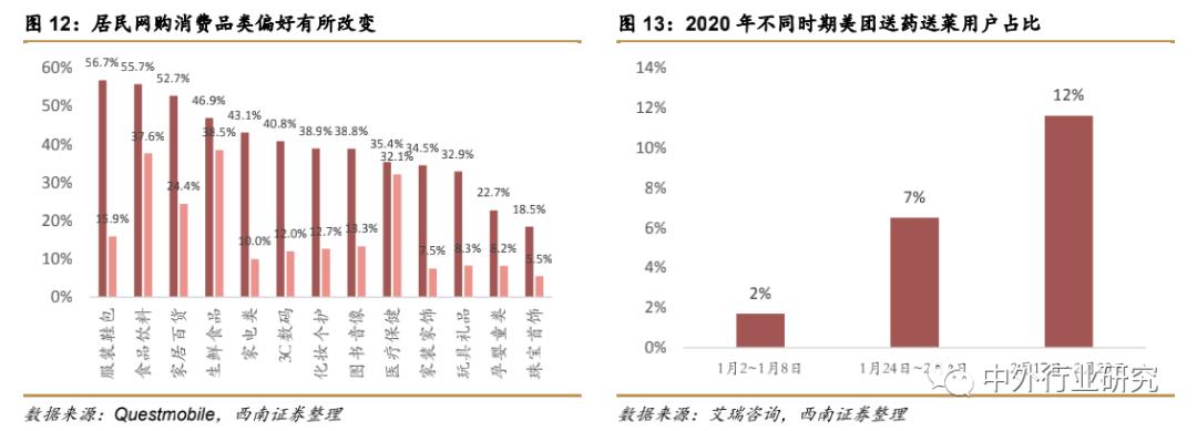 线上消费品类偏好亦向必选转移。可以看到作为必选消费的食品饮料、生鲜刚需属性在疫情期间并未减弱,同时疫情支撑医疗保健品的线上消费保持强劲。