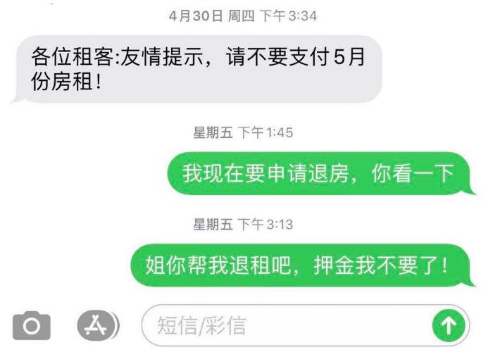 4月30日,吴女士接到了一则来自青客公寓管理员的短信,短信显示:“友情提示,请租客不要缴纳5月的房租。”