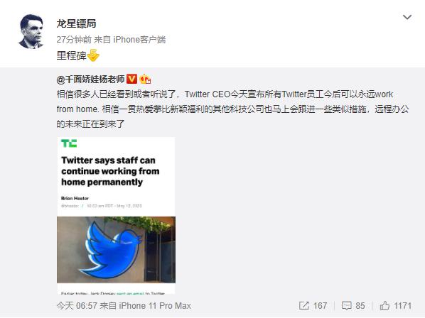 网友盛赞推特打造了「work from home」的里程碑,想必这一做法也会引起其他科技巨头的效仿。
