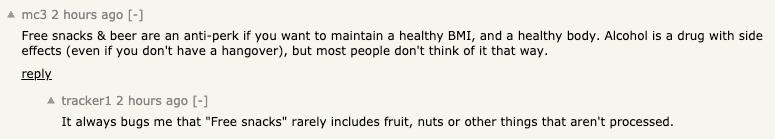 唯一的好处是公司有可能会提供零食、免费啤酒等福利,但本质上这都是对健康不利的食物。