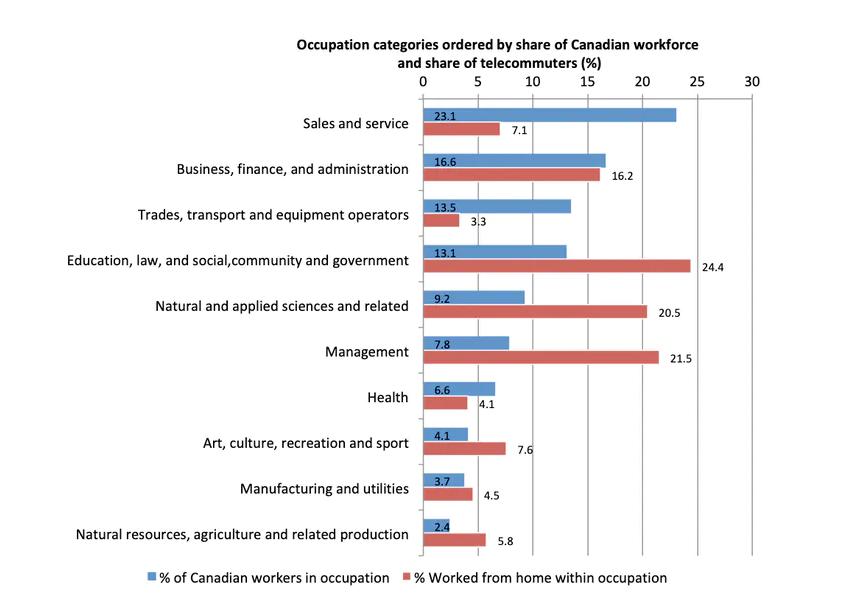 如下图所示,在 GSS 调研中,加拿大雇佣人员最多的职业类别中,远程办公的比例非常低。10 种职业类别里只有 4 种类别的远程化程度较高,同时低收入工种很难进行远程办公。