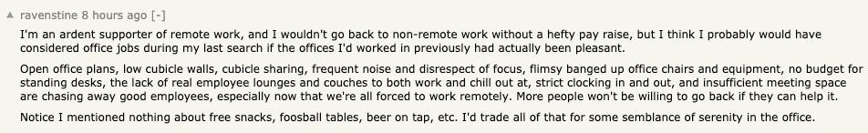 「开放的办公空间、低矮的隔板、频繁的噪音、不怎么舒适的椅子,没有真正的休息室和沙发,永远也找不到空着的会议室…… 如果有的选,真的不想回到办公室去。」