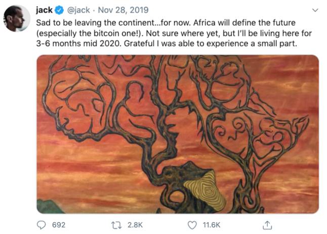 经历了在非洲的短期访问之后,Jack Dorsey 表示自己对非洲大陆这片土地爱得深沉,并打算 2020 年搬到这里住一段时间。