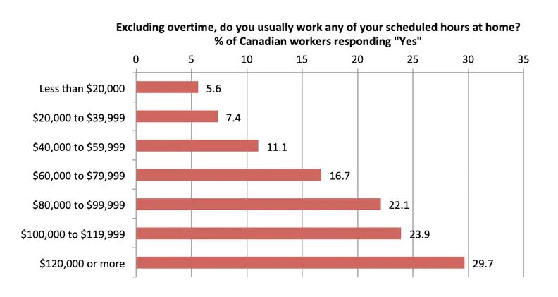 如上图所示,根据 2015 年的数据来看,远程办公的人数随着其个人收入的增加而增加。片面地讲,一个人的工资越高,他在家工作的概率就越大。