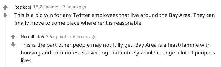 这份「开天辟地」的声明意味着,一些年龄较大、需要照顾家庭的推特员工,或是因生活成本过高、生活方式不同而不想住在大城市的推特员工,可以选择搬去任何地方,并开始在家办公。
