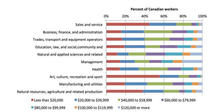 2015 年 GSS 统计中,加拿大各大工种的收入情况。根据调查显示,部分人员为了远程办公甚至可以接受更低的薪资。