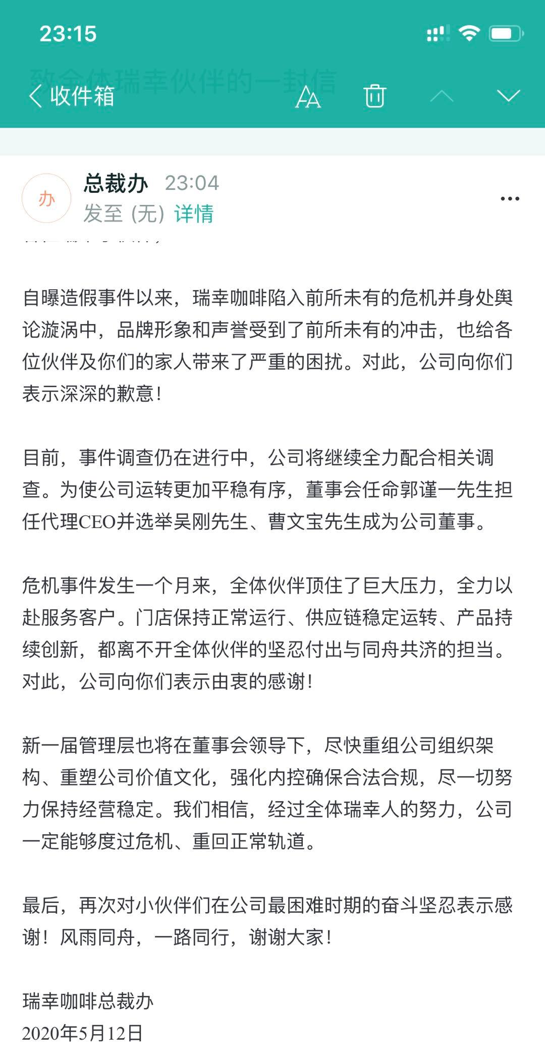 除了把涉及造假的人员丢出管理层之外,几乎在昨晚同一时间,网上流传出瑞幸总裁办发布的内部邮件截图, 在这封邮件中,瑞幸向公司员工表达了歉意,称“给各位伙伴及你们的家人带来了严重的困扰。对此,公司向你们表示深深的歉意。”同时瑞幸称自爆造假后,让公司“陷入前所未有的危机并身处舆论漩涡中”,品牌形象和声誉受到前所未有的冲击。截至目前,瑞幸方面并未回应该截图内容。