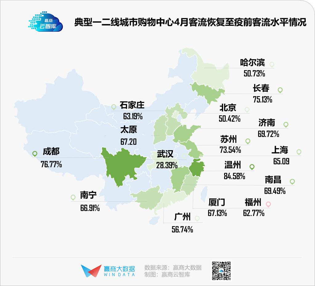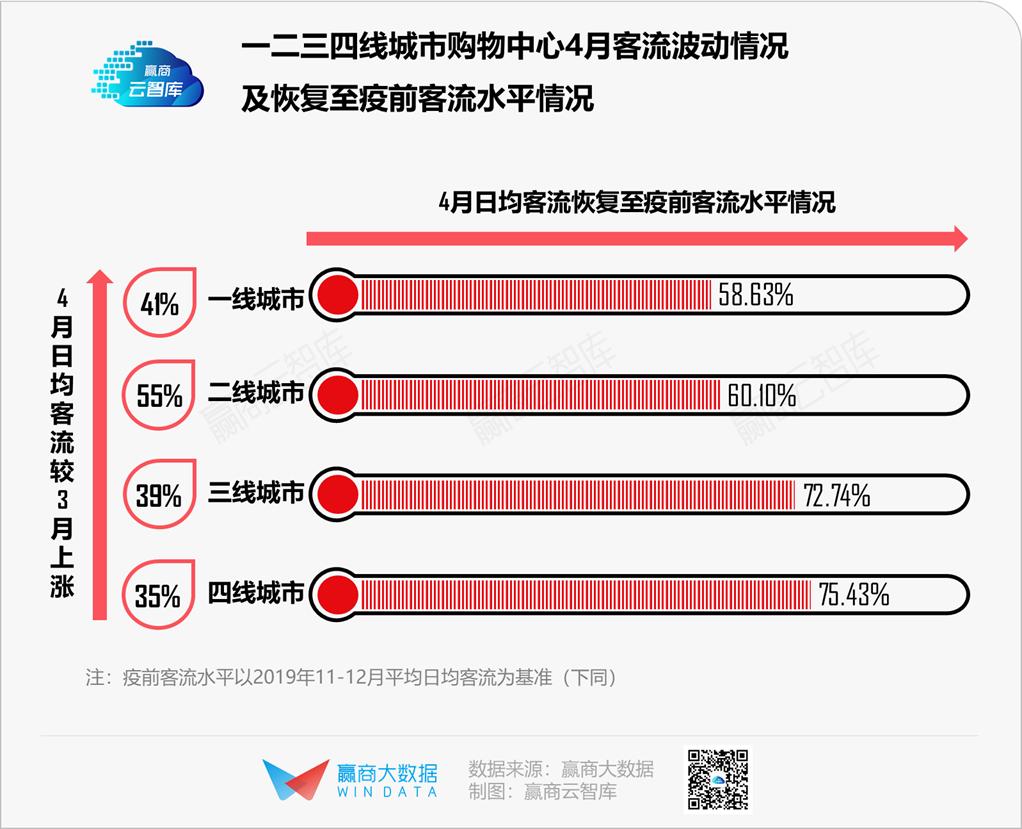 一线城市仍受境外输入病例影响,民众出行顾虑未解,客流回暖表现仍较“淡定”;二线城市包括武汉商业则快速提振,购物中心客流较3月上涨55%,恢复至疫前水平6成。