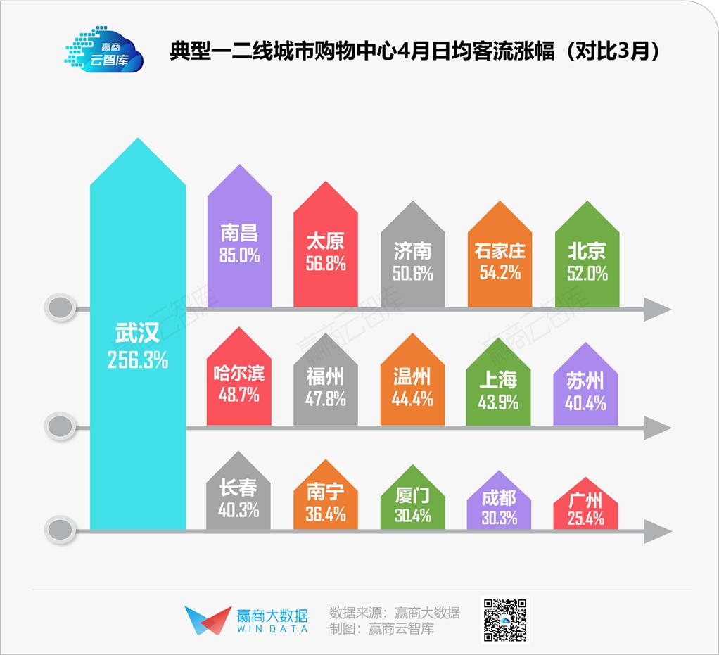 从4月客流涨幅来看,武汉在“解封”后快速回弹,较3月客流上涨256.3%,随着经营时间、各业态门店的逐步恢复,以及华夏幸福武汉长江中心项目正式动工、融创中国签约武汉黄陂长江文旅城项目、永旺购物中心签订意向落户洪山区,沃尔玛、盒马、茶颜悦色等品牌积极进驻,为武汉商业“重启”注入信心,当前客流仅恢复至疫前水平不足30%的武汉商业将迎来更大回暖空间。